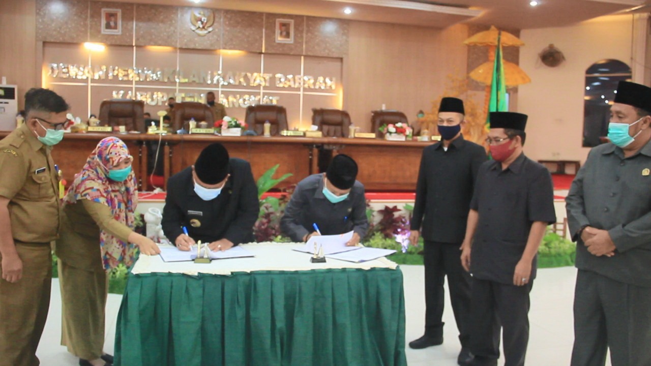 LANGKAT, SUMUTPOS.CO-Bupati Langkat Terbit Rencana Perangin-angin bersama Ketua DPRD Langkat Surialam, menandatangani nota kesepakatan Kebijakan Umum Anggaran-Prioritas Plafon Anggaran Sementara (KUA PPAS) APBD Kabupaten Langkat Tahun Anggaran 2021 di ruang Rapat Paripurna DPRD Langkat, Kecamatan Stabat, Selasa (10/11).