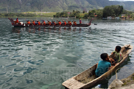 Peserta lomba Solu Bolon saat mendayung perahunya di Danau Toba, Samosir, Rabu (11/9). Perlombaan Solu Bolon tersebut merupakan rangkaian kegiatan untuk memeriahkan Festival Danau Toba yang digelar setiap tahunnya.