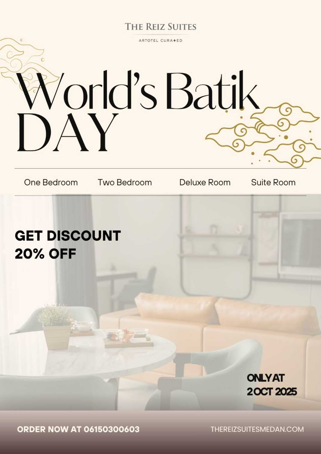Promo ini berlaku untuk reservasi maupun walk-in, memberikan kesempatan bagi para tamu untuk merayakan Hari Batik Nasional dengan cara yang lebih berkesan bersama The Reiz Suites.