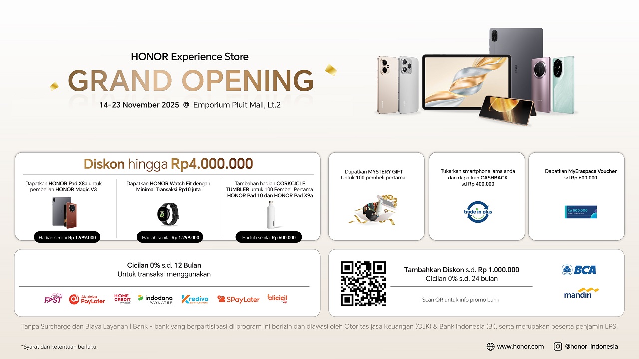 Selama periode grand opening HONOR Experience Store di Emporium Pluit, lantai 2, pada 14–23 November 2025, pelanggan bisa upgrade perangkat dengan lebih mudah dan hemat melalui berbagai promo dan diskon menarik. Pelanggan berkesempatan mendapatkan diskon hingga Rp4.000.000, bonus HONOR Pad X8a untuk setiap pembelian HONOR Magic V3, dan hadiah HONOR Watch Fit pada transaksi minimal Rp10.000.000.