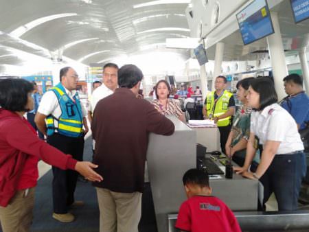 TINJAU: Anggota DPD RI Parlindungan Purba saat meninjau ke Counter Chek In Tiket Maskapai Lion Air di Bandara Kaalanamu, Deliserdang, Kamis (24/1).