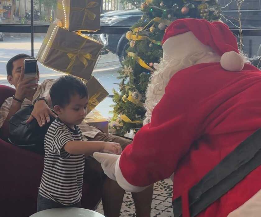 Tak hanya itu, suasana Natal semakin terasa dengan kehadiran Santa Claus di area lobby hotel yang secara khusus menyapa dan membagikan berbagai makanan ringan seperti bolu, lollipop, yupi, jelly, dan aneka snack favorit anak-anak. Momen ini menjadi daya tarik tersendiri, terutama bagi tamu keluarga yang menginap bersama buah hati mereka.