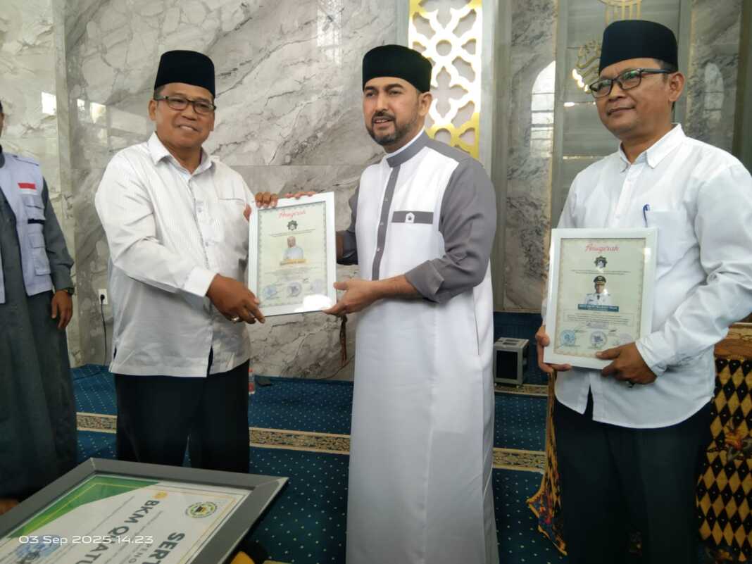 MEDAN, SUMUTPOS.CO- Masjid Quatul Muslimin, Jalan HM Jhoni Medan menjadi masjid Percontohan di Kota Medan. Predikat ini ditandai dengan penyerahan sertifikat oleh Ketua Pengurus Wilayah Dewan Masjid Indonesia H Irhamuddin MA kepada Ketua BKM Quatul Muslimin Drs H Rivai Nasution MM di sela acara Gebyar Tabligh Akbar dalam rangka Safari Dakwah Menyambut Maulid Nabi Muhammad SAW bersama Habib Ahmad Al Habsyi di masjid tersebut, Rabu (3/9/2025).