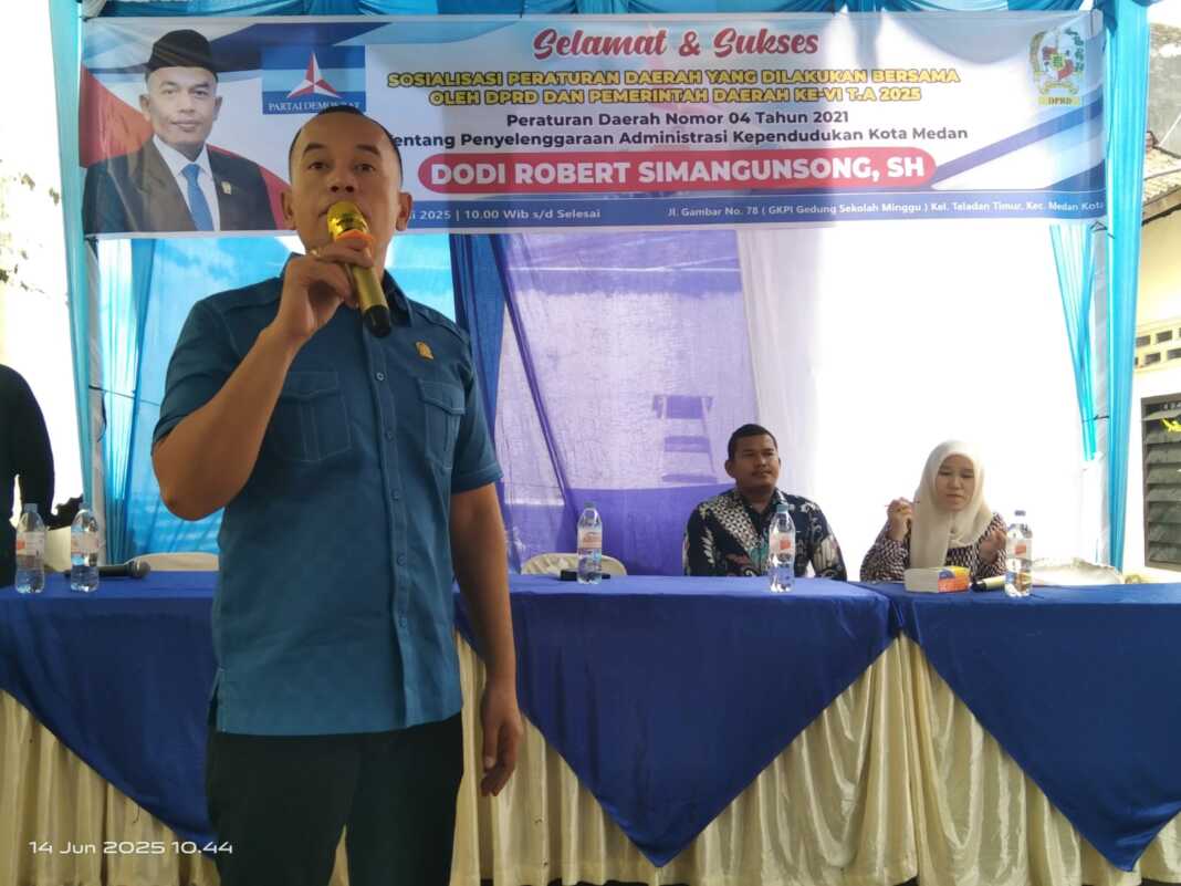 Hal ini disampaikan Dodi ketika menggelar Sosialisasi Peraturan Daerah (Sosperda) ke-6 Tahun 2025 Perda Nomor 03 Tahun 2021 tentang Penyelenggaraan Administrasi Kependudukan di dua lokasi, yakni Jalan Turi Ujung Kelurahan Binjai, Medan Denai, dan Jalan Gambar, Kelurahan Teladan Barat, Medan Kota, Sabtu (14/06/2025). Hadir dalam sosialisasi ini perwakilan dari Kecamatan Medan Denai dan Medan Kota, Dinas Kependudukan dan Catatan Sipil (Disdukcapil), dan Dinas Sosial Kota Medan.