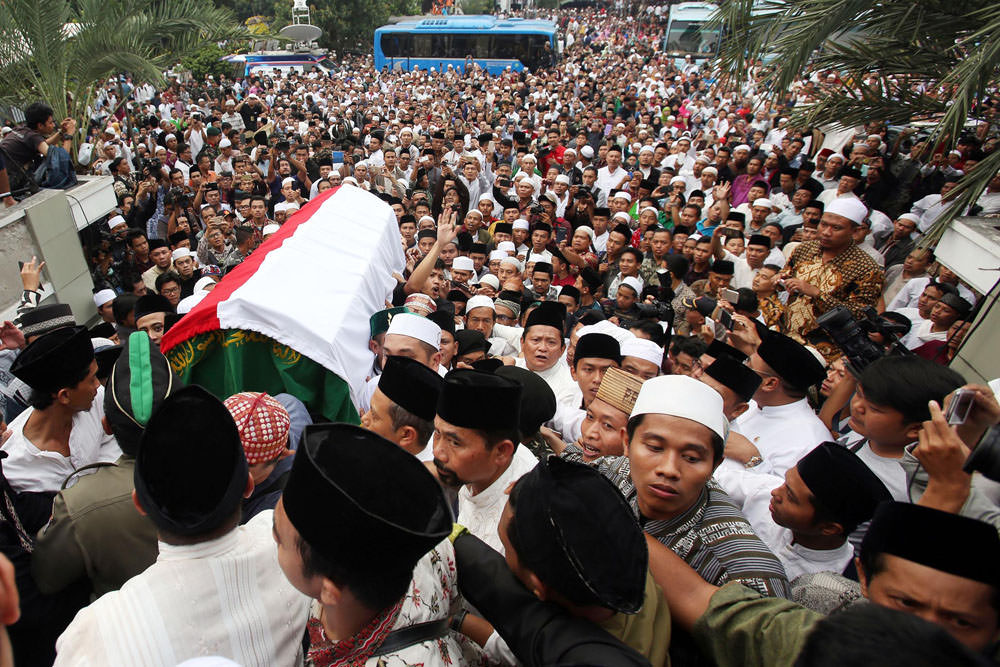 Ribuan warga mengiringi jenazah alm. KH. Ahmad Hasyim Muzadi sebelum dishalatkan di Komplek Pesantren Al Hikam, Depok, Jawa Barat, Kamis (16/3). Mantan Ketua Umum PBNU yang juga anggota Dewan Pertimbangan Presiden tersebut wafat pada Kamis (16/3) pagi, setelah sempat dirawat di ruang ICU Rumah sakit Lavalette, Malang.