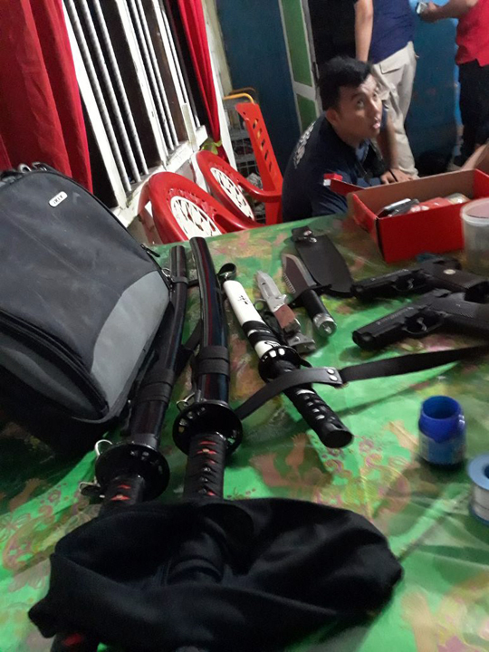Selian itu juga ditemukan 5 samurai, 3 tabung gas nitrogen, sangkur, pisau lipat, peluru gotri, dan gulungan timah, gunting, tas merek Acer, sim card, flash disk, CD, thermometer alkohol, botol mineral berisi cairan bening, slip transfer uang, uang tunai Rp550 ribu serta 3 pucuk pistol airsoft gun, termasuk satu yang digunakan pelaku untuk melawan petugas.