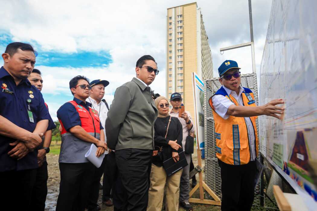 Dalam peninjauan ke Kolam Detensi, Rico Waas bersama Direktur Sungai dan Pantai Direktorat Jenderal Sumber Daya Air Kementerian Pekerjaan Umum dan Pihak World Bank terlihat berdiskusi sembari melihat papan yang berisikan rencana dan target pengembangan Kolam Detensi Selayang.