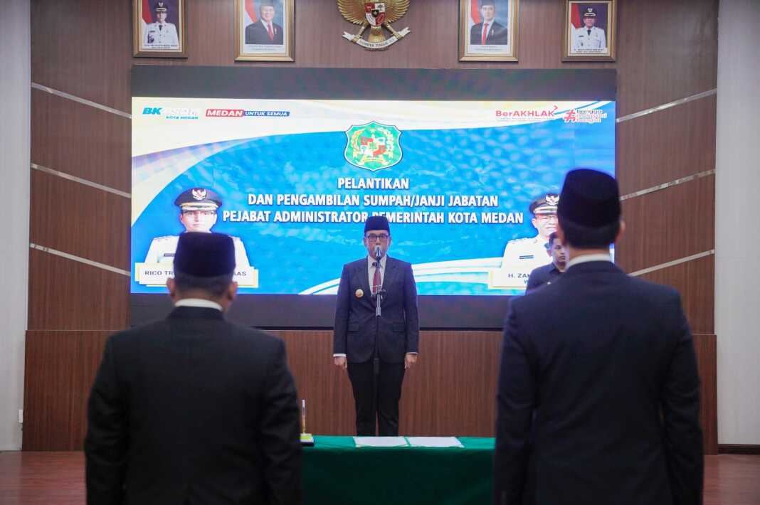 MEDAN, SUMUTPOS.CO – Sejak dilantik menjadi Wali Kota Medan, baru ini kali pertama Rico Tri Putra Bayu Waas melantik pejabat di lingkungan Pemko Medan. Ada 4 Pejabat Administrator di lingkungan Pemko Medan yang dilantik dan diambil sumpahnya di Balai Kota Medan, Senin (23/6/2025) sore.