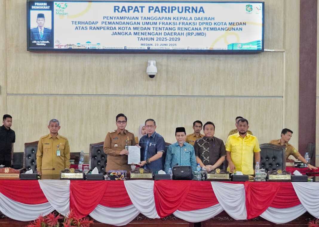 Hal tersebut diungkapkan Wali Kota Medan Rico Tri Putra Bayu Waas saat menyampaikan Tanggapan Kepala Daerah Terhadap Pemandangan Umum Fraksi-Fraksi DPRD Kota Medan atas Ranperda Kota Medan Tentang Rencana Pembangunan Jangka Menengah Daerah (RPJMD) Kota Medan Tahun 2025-2029 dalam lanjutan rapat paripurna DPRD Kota Medan yang diadakan di Gedung DPRD Kota Medan, Senin (23/6/2025).