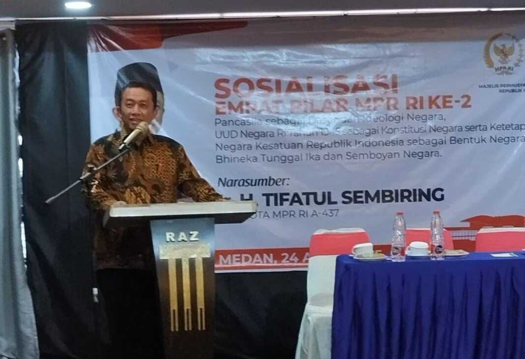 MEDAN, SUMUTPOS.CO – Salah satu aspek penting dalam memajukan negara ini, adalah sinergitas antara pemerintah pusat dan daerah. Hal ini disampaikan Anggota DPR/MPR RI Tifatul Sembiring ketika menggelar Sosialisasi 4 Pilar MPR RI di RAZ Hotel, Jalan DR Mansyur Medan, Kamis (24/4).
