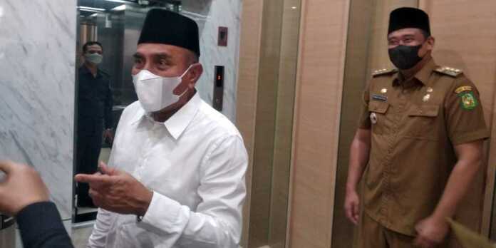 Gubenur Sumatera Utara, Edy Rahmayadi dan Wali Kota Medan, Muhammad Bobby Afif Nasution melakukan pertemuan dan rapat soal penanganan banjir di Kota Medan di Kantor Gubernur Sumut di Jalan Dipenogoro, Kota Medan, Selasa (8/3).
