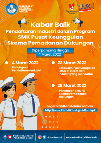 JAKARTA, SUMUTPOS.CO – Kementerian Pendidikan, Kebudayaan, Riset, dan Teknologi (Kemendikbudristek) memperpanjang batas pendaftaran program SMK Pusat Keunggulan (SMK PK) Skema Pemadanan Dukungan bagi industri, yakni dari semula tanggal 19 Februari 2022 menjadi tanggal 4 Maret 2022. Perpanjangan ini dilakukan dengan pertimbangan, tingginya antusiasme industri potensial untuk dalam program SMK PK.