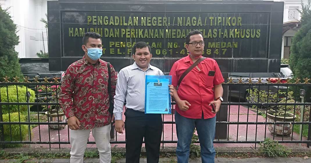 USAI SIDANG: Penasihat hukum tergugat, Yosua Panjaitan (tengah) usai menjalani sidang gugatan di PN Medan, Senin (1/2).GUSMAN/SUMUT POS.